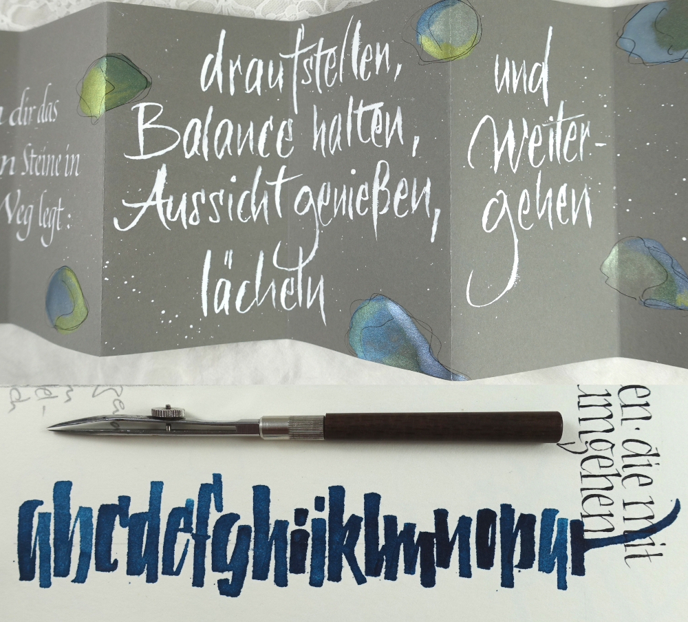 In diesem Kurs möchte ich Euch in die schwungvolle, ja schon tanzende Kunst der Spitzfeder einführen. Ein erlesenes Werkzeug für ein erlesenes Schreib- und Leseerlebnis. Wunderschön mit dem Schwellzug und in vielen kalligrafischen Situationen anwendbar, wie Grußkarten, Sprüche, kleine Bilder, einfach alles aus der Papeterie des Lebens. In ihrer Zartheit findet sich doch eine beachtliche Stärke und Ausdruckskraft.